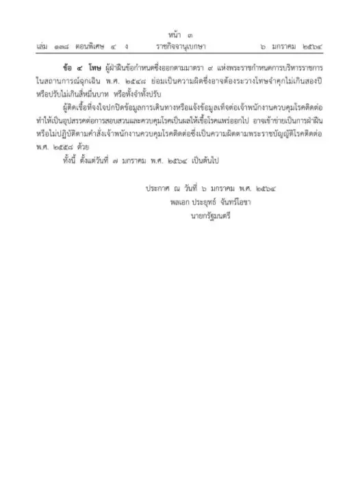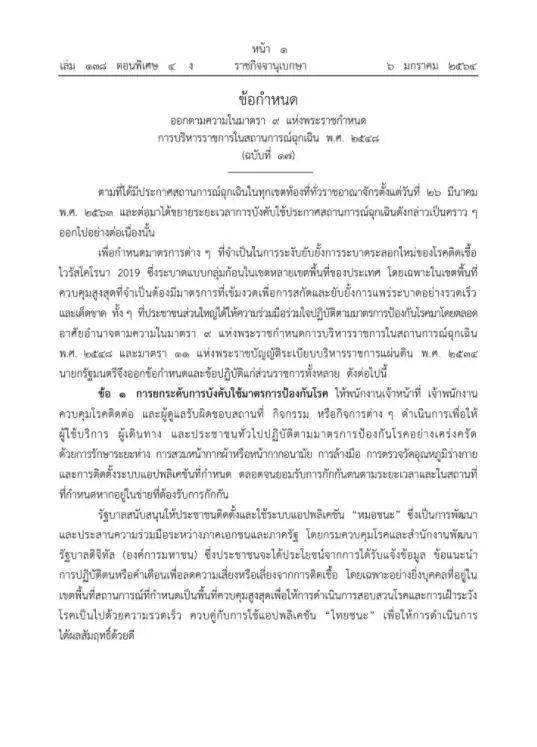6 ม.ค. 64 เว็บไซต์ราชกิจานุเบกษา เผยแพร่ ข้อกำหนดออกตามความในมาตรา 9 แห่งพระราชกำหนด การบริหารราชการในสถานการณ์ฉุกเฉิน พ.ศ. 2548 (ฉบับที่ 17) ตามที่ได้มีประกาศสถานการณ์ฉุกเฉินในทุกเขตท้องที่ทั่วราชอาณาจักรตั้งแต่วันที่ 26 มีนาคมพ.ศ. 2563 และต่อมาได้ขยำยระยะเวลาการบังคับใช้ประกาศสถานการณ์ฉุกเฉินดังกล่าวเป็นคราวๆ ออกไปอย่างต่อเนื่องนั้น