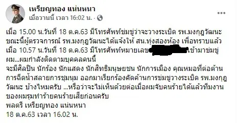 “เมื่อ 15.00 น.วันที่ 18 ต.ค.63 มีโทรศัพท์ข่มขู่ว่าจะวางระเบิด รพ.มงกุฎวัฒนะ ขณะนี้ผู้ตรวจการณ์ รพ.มงกุฎวัฒนะได้แจ้งให้ สน.ทุ่งสองห้อง เพื่อทราบแล้ว เมื่อ 10.57 น.วันที่ 18 ต.ค.63 มีโทรศัพท์หมายเลข —— เข้ามาข่มขู่ผม