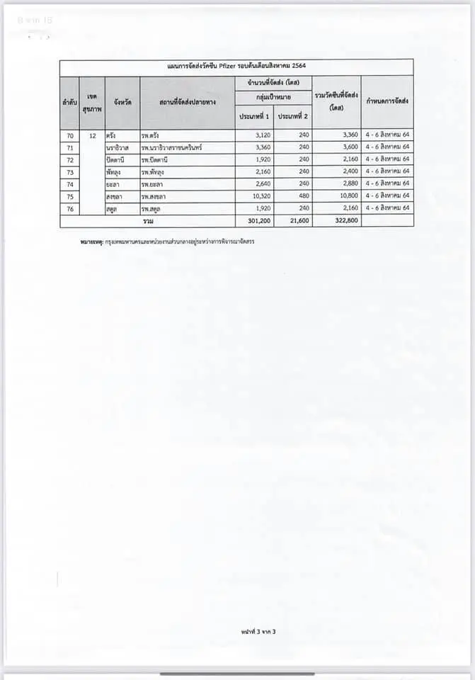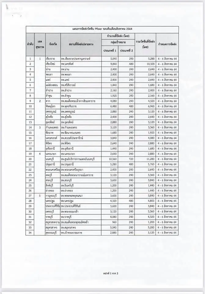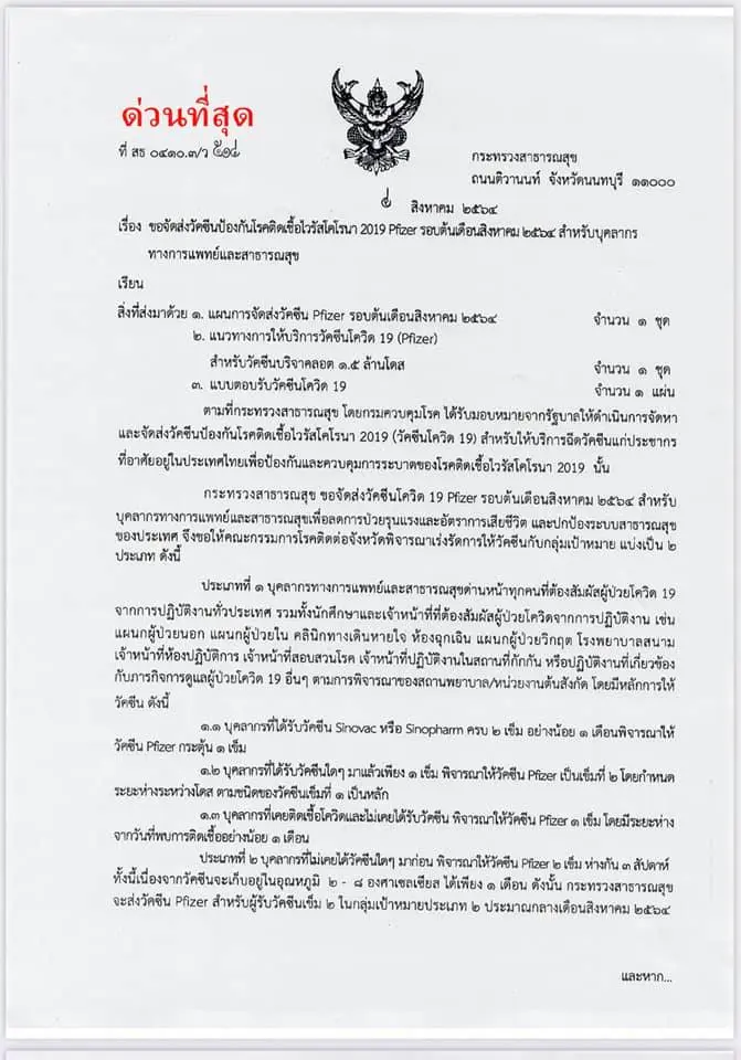 1.เจ้าหน้าที่ทางการแพทย์และสาธารณสุขที่ให้บริการด่านหน้า ได้มีการยื่นความจำนงค์ตามสิทธิการฉีดเข็ม 3 ถึง 10,093 คน และขอรับวัคซีนไฟเซอร์ (Pfizer) รายใหม่ เข็ม 1 และ 2 จำนวน 240 คน (480 โดส) รวมทั้งหมด 10,573 โดส โดยได้รับการจัดสรรวัคซีนไฟเซอร์ (Pfizer) เมื่อวันที่ 6 สิงหาคม ที่ผ่านมา พร้อมกันทั่วประเทศ จำนวน 7,200 โดส ซึ่งแบ่งเป็น