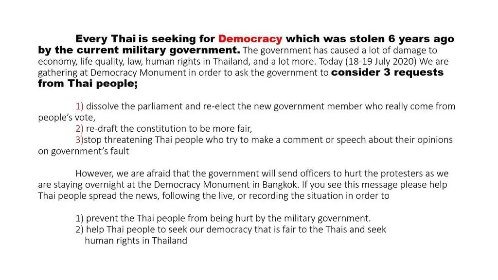 ชาวเน็ตร่วมกันติดแฮชแท็ก #respectdemocracyTHAI ปั่นกระแส เยาวชนปลดแอก ต่อ พร้อมทั้งร่วมกันกระจายข่าวการชุมนุมในวันที่ 18 ก.ค. ออกไปเป็นภาษาต่างๆ อาทิ ภาษาอังกฤษ ภาษาจีน ภาษาญี่ปุ่น ภาษาเกาหลี ภาษาเวียดนาม เป็นต้น หลังเยาวชนปลดแอก ได้ประกาศยุติการชุมนุม พร้อมทั้งยกเลิกกิจกรรม “นอนเฝ้าประชาธิปไตย” และ “ปลุกรัฐบาล” ในวันนี้อีกด้วย หลังกังวลเรื่องความปลอดภัยของประชาชนที่เข้าร่วมการชุมนุมเป็นจำนวนมาก