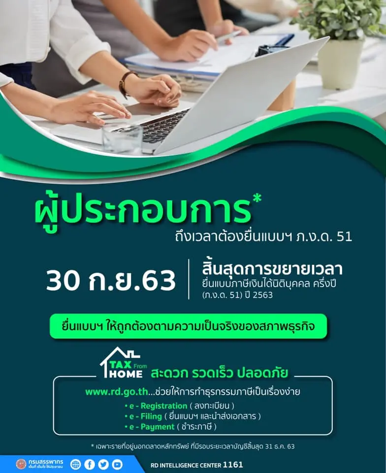 จึงขยายเวลาการยื่นแบบฯ ถึงวันที่ 30 กันยายน 2563 โดยต้องปฏิบัติให้เป็นไปตามเงื่อนไขที่กฎหมายกำหนดและชำระภาษีให้ถูกต้องตามความเป็นจริงของสภาพธุรกิจ พร้อมเชิญชวนให้ยื่นแบบฯ ผ่านทางอินเทอร์เน็ต ตามโครงการ “ทำธุรกรรมภาษีที่บ้าน” (TAX from Home) จะช่วยให้การทำธุรกรรมภาษีเป็นเรื่องง่ายที่ www.rd.go.th ทั้งการลงทะเบียน (e-Registration) การยื่นแบบฯ และนำส่งเอกสารที่เกี่ยวข้อง (e-Filing)การช าระภาษี (e-Payment) ที่สะดวก รวดเร็ว ปลอดภัย”