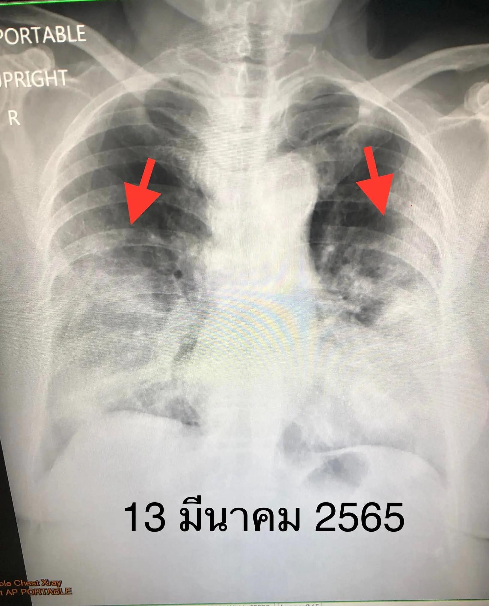 เข้านอนใน รพ.วันที่ 5-9 มีนาคม ระหว่างอยู่รพ. 5 วัน ไม่เหนื่อย ไม่มีไข้ วัดระดับออกซิเจนปกติ เอกซเรย์ปอดปกติ อนุญาตให้กลับบ้าน หลังกลับบ้าน 2 วัน เริ่มมีเหนื่อย หายใจลำบาก แน่นหน้าอก ไม่มีไข้ วัดระดับออกซิเจนเหลือ 92% เรียกรถฉุกเฉินมาส่งโรงพยาบาลวันที่ 12 มีนาคม เอกซเรย์ปอดมีฝ้าขาวทั้ง 2 ข้างเข้าได้กับปอดอักเสบจากการติดเชื้อไวรัสโควิด-19 (ดูรูป) ได้ให้ยาสเตียรอยด์ และยาเรมเดซิเวียร์ชนิดฉีด คนไข้ดีขึ้นเร็วใน 5 วัน