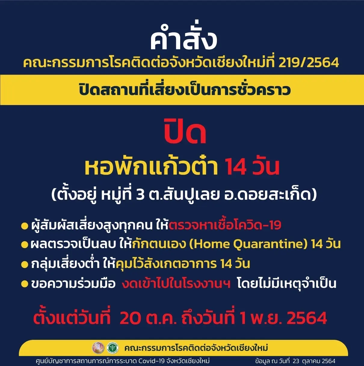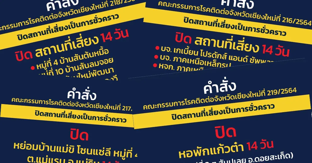 เชียงใหม่ยังน่าเป็นห่วง! คณะกกรมการโรคติดต่อจังหวัด เชียงใหม่ ออกคำ สั่งปิดสถานที่เสี่ยง ในพื้นที่ 4 อำเภอ 14 วัน และขอความร่วมมืองดเดินทางเข้าออก