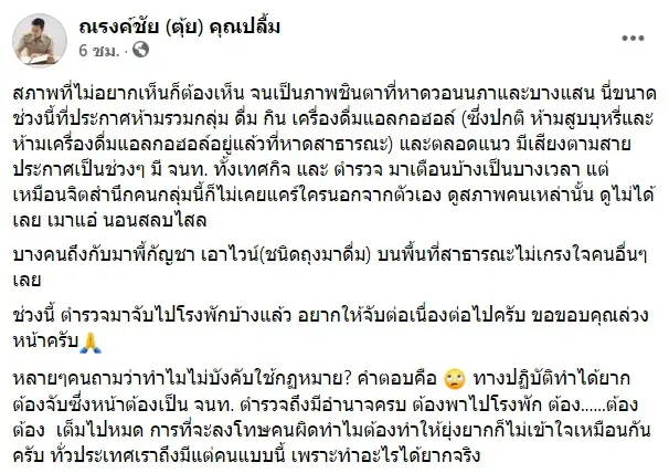 นายณรงค์ชัย คุณปลื้ม นายกเทศมนตรี เมืองแสนสุข จ.ชลบุรี ได้โพสต์ภาพกลุ่มประชาชนนั่งดื่ม กิน เสพ บริเวณริมหาดบางแสนและหาดวอนนภา มีสภาพมึนเมาพร้อมระบุข้อความว่า