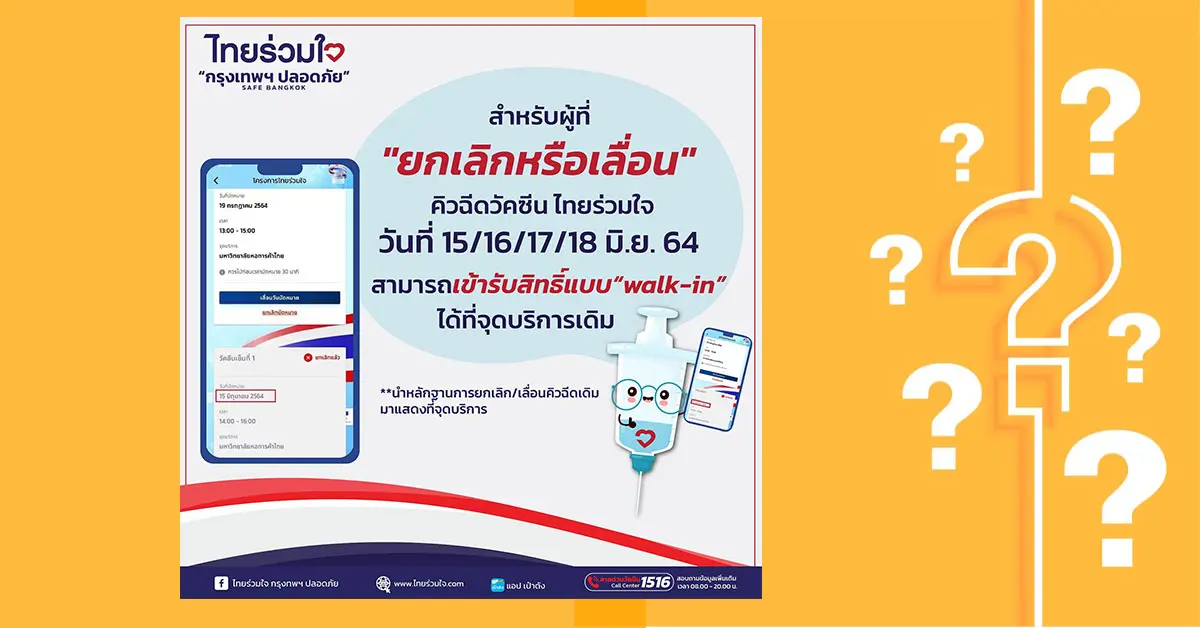 เมื่อทางไทยร่วมใจออกประกาศนัดฉีดวัคซีนอีกครั้ง แต่ทำไงดี? หาก ยกเลิก-เลื่อนคิวฉีดวัคซีนโควิด ผ่าน “ไทยร่วมใจ” ไปแล้ว ที่นี่มีคำตอบ