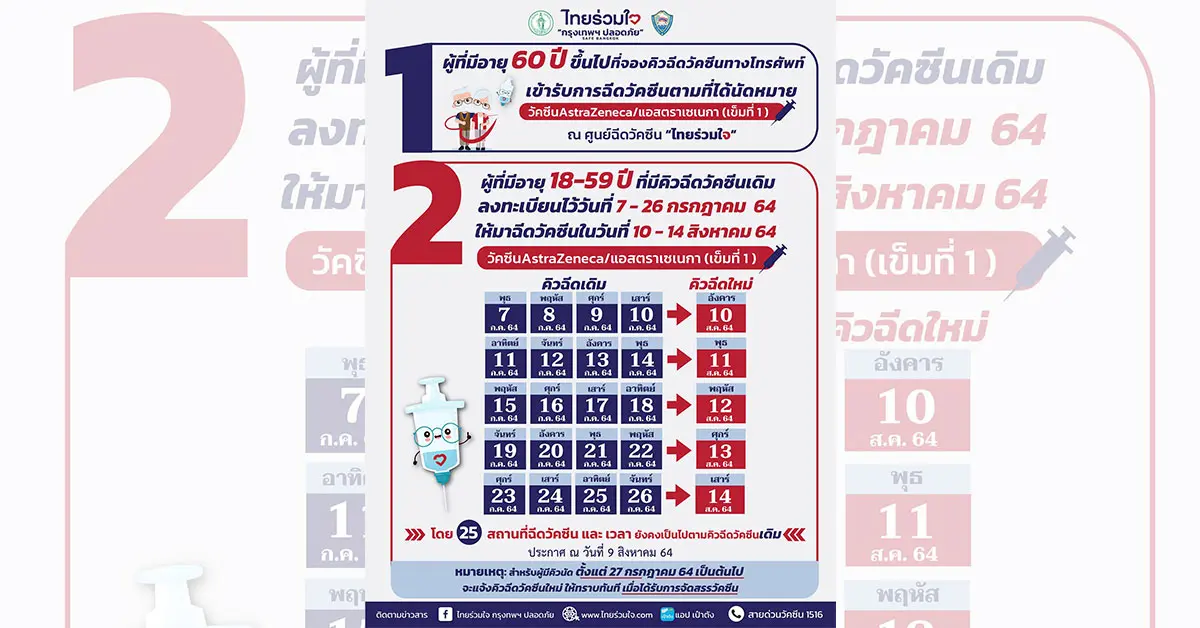 - คิวฉีดเดิม 23-26 ก.ค.2564 – คิวฉีดใหม่วันเสาร์ที่ 14 ส.ค. 64