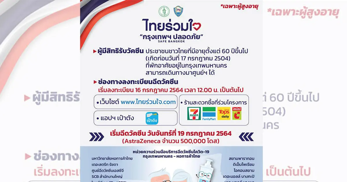 เมื่อวานที่ผ่านมา ทางเพจเฟซบุ๊ก “ไทยร่วมใจ กรุงเทพฯ ปลอดภัย Safe Bangkok” ได้ลงโพสต์ประกาศเปิดลงทะเบียนฉีดวัคซีนสำหรับกลุ่มผู้สูงอายุ 60 ปีขึ้นไป ซึ่งเริ่มลงทะเบียนในวันนี้เป็นวันแรก 16 กรกฎาคม 2564 และเริ่มฉีดในวันที่ 19 กรกฎาคม 2564 วัคซีนที่ได้รับการจัดสรรในครั้งนี้คือ วัคซีนแอสตร้าเซนเนก้า จำนวน 5 แสนโดส ซึ่งสามารถลงทะเบียนได้ทั้งหมด 3 ช่องทาง