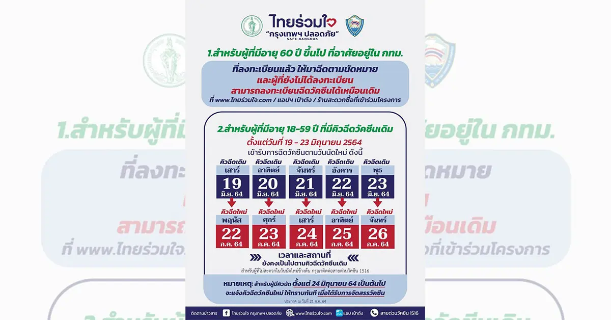 ไทยร่วมใจ – เมื่อวันที่ 21 กรกฎาคม 2564 ทางเพจเฟซบุ๊ก ไทยร่วมใจ กรุงเทพฯ ปลอดภัย Safe Bangkok ได้ประกาศคิวการฉีดวัคซีน ซึ่งเป็นคิวใหม่สำหรับกลุ่มประชาชน 18-59 ปี ขึ้นไป ที่ลงทะเบียนจองวัคซีนในวันที่ 19-23 มิถุนายน 2564 ซึ่งก่อนหน้านี้ถูกเลื่อนคิวมาอย่างไม่มีกำหมด โดยสามารถไปตามเวลา และสถานทีเดิน ที่เคยนัดหมายเอาไว้ และแจ้งวันเข้ารับการฉีดวัคซีนตามวันนัดใหม่ ดังนี้