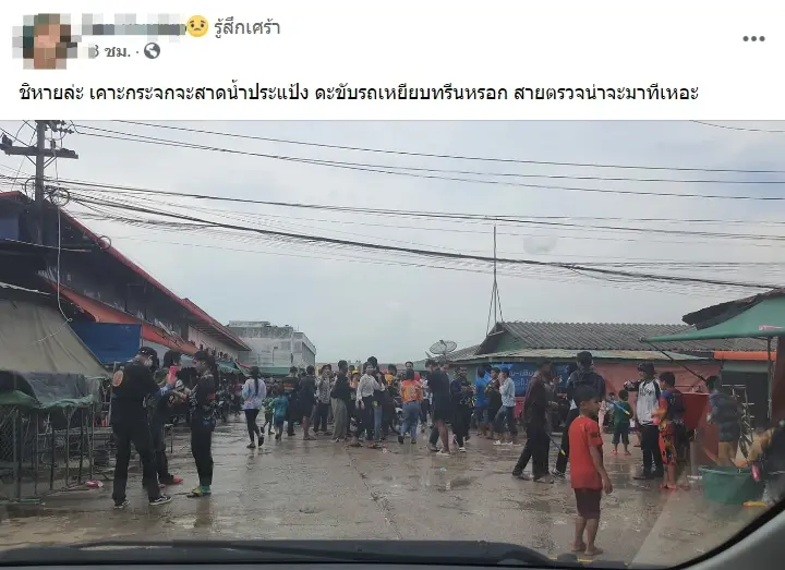 แต่ล่าสุด ได้มีผู้ใช้เฟซบุ๊กรายหนึ่ง เผยแพร่ภาพของคนบางกลุ่มโดยลักษณะภาพเป็นการสาดน้ำกันอย่างสนุกสนาน ซึ่งผู้โพสต์ได้ระบุข้อความว่า “ชิหายล่ะ เคาะกระจกจะสาดน้ำประแป้ง ดะขับรถเหยียบทรีนหรอก สายตรวจน่าจะมาทีเหอะ”