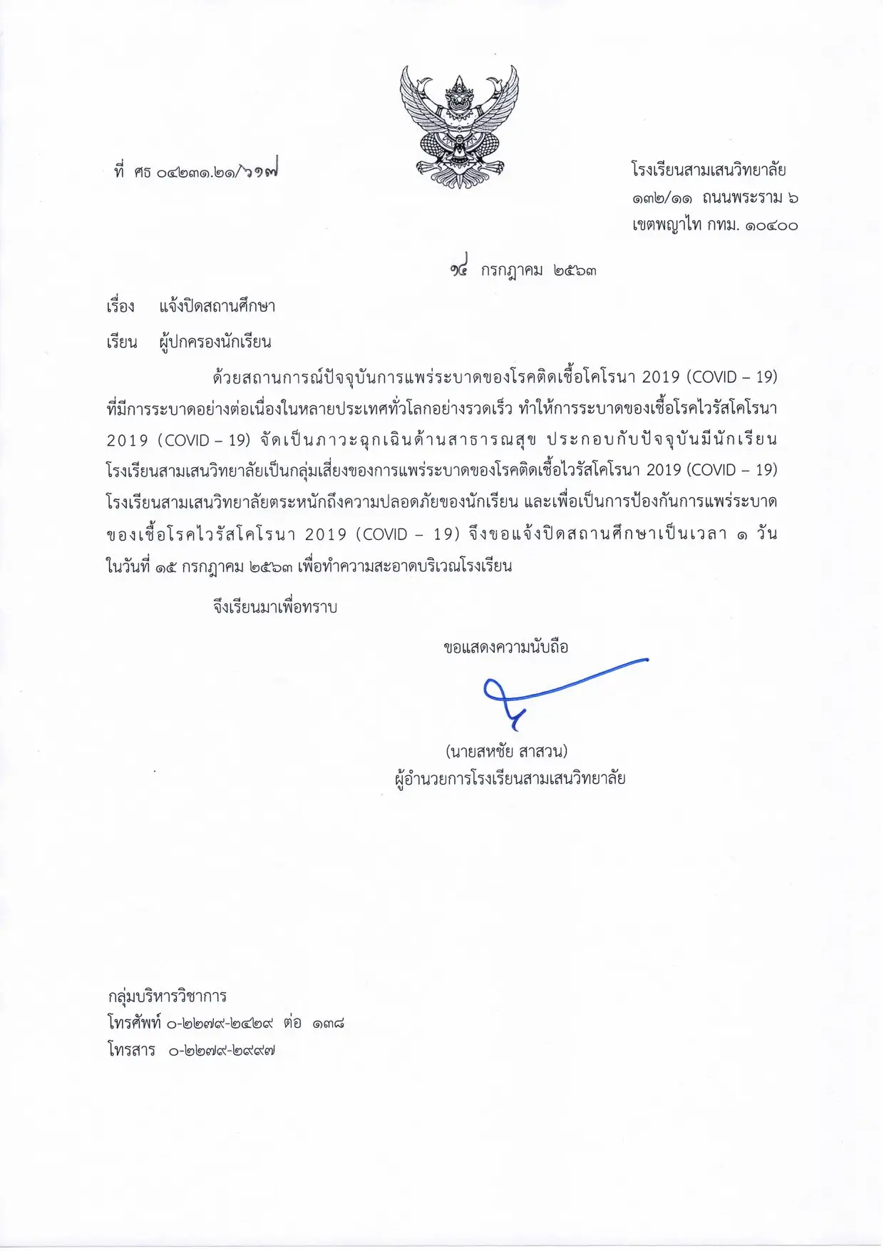 หนังสือดังกล่าวมีเนื้อหาระบุว่า ด้วยสถานการณ์ปัจจุบันการแพร่ระบาดของโรคติดเชื้อโคโรนา2019 ที่มีการระบาดอย่างต่อเนื่องในหลายประเทศทั่วโลกอย่างรวดเร็ว ทำให้การระบาดของเชื้อโรคไวรัสโคโรนา 2019 จัดเป็นภาวะฉุกเฉินด้านการสาธารณสุข ประกอบกับปัจจุบันมีนักเรียนโรงเรียนสามเสนวิทยาลัย เป็นกลุ่มเสี่ยงของการแพร่ระบาดของโรคติดเชื้อไวรัสโคโรนา 2019 โรงเรียนสามเสนวิทยาลัย ตระหนักถึงความปลอดภัยของนักเรียน และเพื่อเป็นการป้องกันการแพร่ระบาดของเชื้อโรคไวรัสโคโรนา2019 จึงขอแจ้งปิดสถานศึกษาเป็นเวลา 1 วัน ในวันที่ 15 ก.ค. เพื่อทำความสะอาดบริเวณโรงเรียน