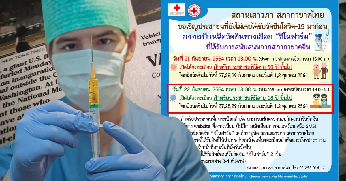 เปิดจองวันนี้! ระบบเปิด 13.00 น. เช็กรายละเอียด ลงทะเบียนวัคซีน “ซิโนฟาร์ม” โดยสภากาชาดไทย รอบวันที่ 21-22 ก.ย. กลุ่มกลุ่มปชช. 18 ปีขึ้นไป