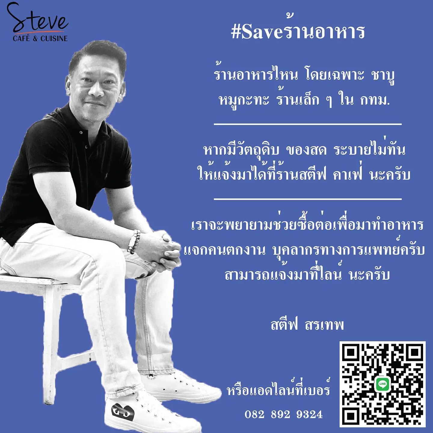 นอกจากเจ้จงที่ออกมาโพสต์ข้อความเป็นส่วนหนึ่งในการช่วยเหลือพ่อค้าแม่ขายในครั้งนี้แล้ว ก็ยังมี คุณ สตีฟ สรเทพ เจ้าของร้านอาหาร Steve Cafe & Cuisine Dhevet Branch ก็ออกมาโพสต์ข้อความผ่านเฟซบุ๊กเพื่อเป็ฯส่วนหนึ่งในการช่วยเหลือโดยระบุข้อความว่า “Saveร้านอาหาร ร้านอาหารไหน โดยเฉพาะ ชาบู หมูกะทะ ร้านเล็กๆใน กทม หากมีวัตถุดิบ ของสด ระบายไม่ทัน ให้แจ้งมาได้ที่ร้านสตีฟ คาเฟ่ นะครับ เราจะพยายามช่วยซื้อต่อเพื่อมาทำอาหารแจกคนตกงาน บุคลากรทางการแพทย์ครับ สามารถแจ้งมาที่ไลน์ นะครับ”