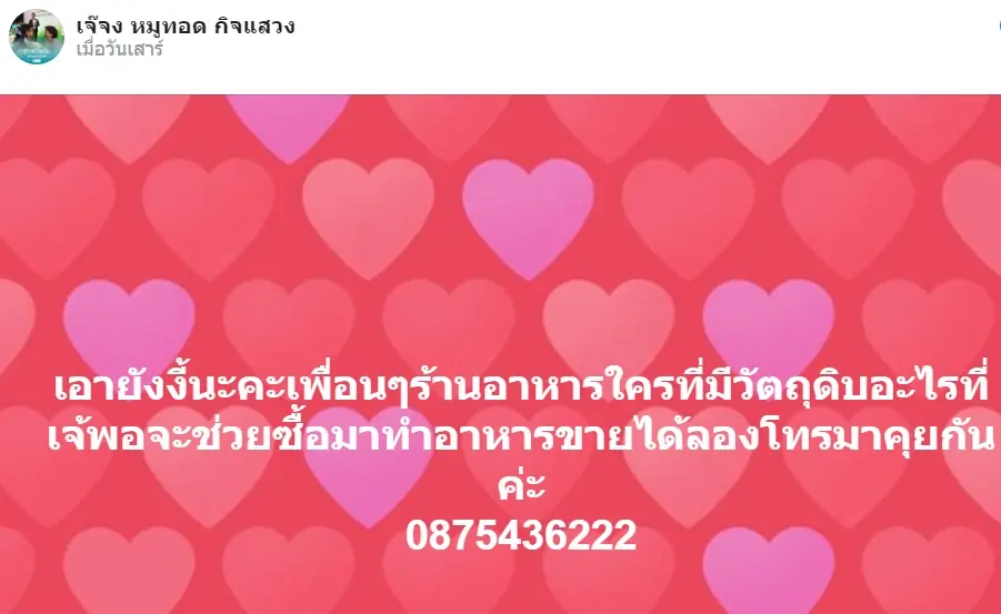 จนล่าสุดเจ้าของร้านหมูทอดเจ้าดังที่มีหลายสาขาอย่าง เจ๊จง ก็ได้ออกมาโพสต์ข้อความผ่านเฟซบุ๊ก เพื่อช่วยเหลือพ่อค้าแม่ขายที่ซื้อวัตถุดิบมาแล้วไม่สามารถเปิดร้านขายได้ โดยระบุข้อความผ่านเฟซบุ๊กว่า “เอาอย่างงี้นะคะเพื่อนๆ ร้านอาหารใครมีวัตถุดิบอะไรที่เจ้พอจะช่วยซื้อมาทำอาหารขายได้ ลองโทรมาคุยกันค่ะ”
