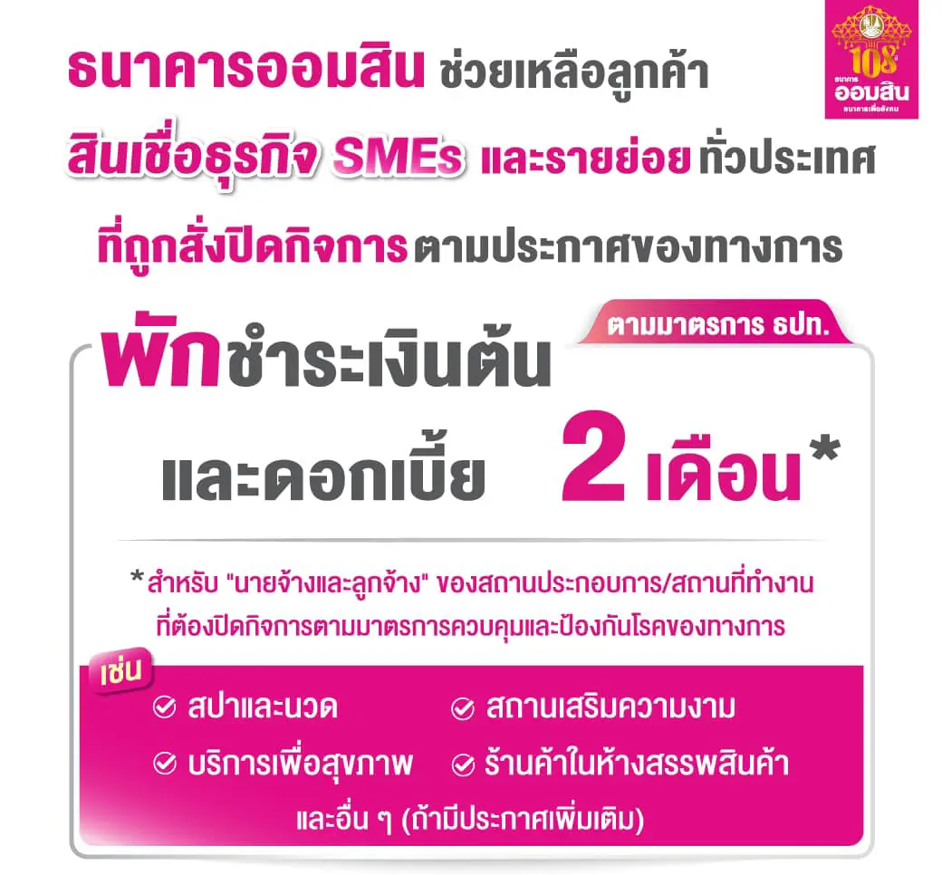 ธนาคารออมสินช่วยเหลือลูกค้าสินเชื่อธุรกิจ SMEs และรายย่อยทั่วประเทศ ที่ถูกสั่งปิดกิจการตามประกาศของทางการ