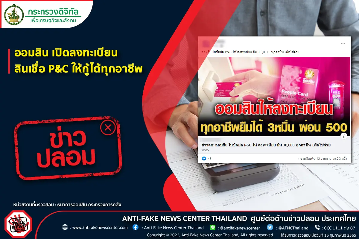 ออมสิน —- เมื่อวันที่ 16 ก.พ. 2565 เฟซบุ๊กเพจศูนย์ต่อต้านความปลอม ประเทศไทยได้โพสต์ข้อความระบุว่า ตามที่ได้มีการส่งต่อข่าวสารในสื่อออนไลน์ถึงประเด็นเรื่อง ธนาคารออมสิน เปิดลงทะเบียนสินเชื่อ P&C ให้กู้ได้ทุกอาชีพ ทางศูนย์ต่อต้านข่าวปลอมได้ตรวจสอบข้อเท็จจริงโดยธนาคารออมสิน กระทรวงการคลัง พบว่าข้อมูลดังกล่าวนั้น เป็นข้อมูลเท็จ