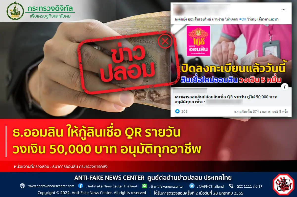 สินเชื่อ QR —- เมื่อวันที่ 28 ม.ค. 2565 เฟซบุ๊กศูนย์ต่อต้านข่าวปลอม ประเทศไทย ได้โพสต์ข้อความระบุว่า ตามที่มีการเผยแพร่ข้อมูลสินเชื่อ ในประเด็นเรื่อง ธนาคารออมสิน ให้กู้ สินเชื่อ QR รายวัน วงเงิน 50,000 บาท อนุมัติทุกอาชีพ ทางศูนย์ต่อต้านข่าวปลอมได้ดำเนินการตรวจสอบข้อเท็จจริงโดย ธนาคารออมสิน กระทรวงการคลัง พบว่าประเด็นดังกล่าวนั้น เป็นข้อมูลเท็จ