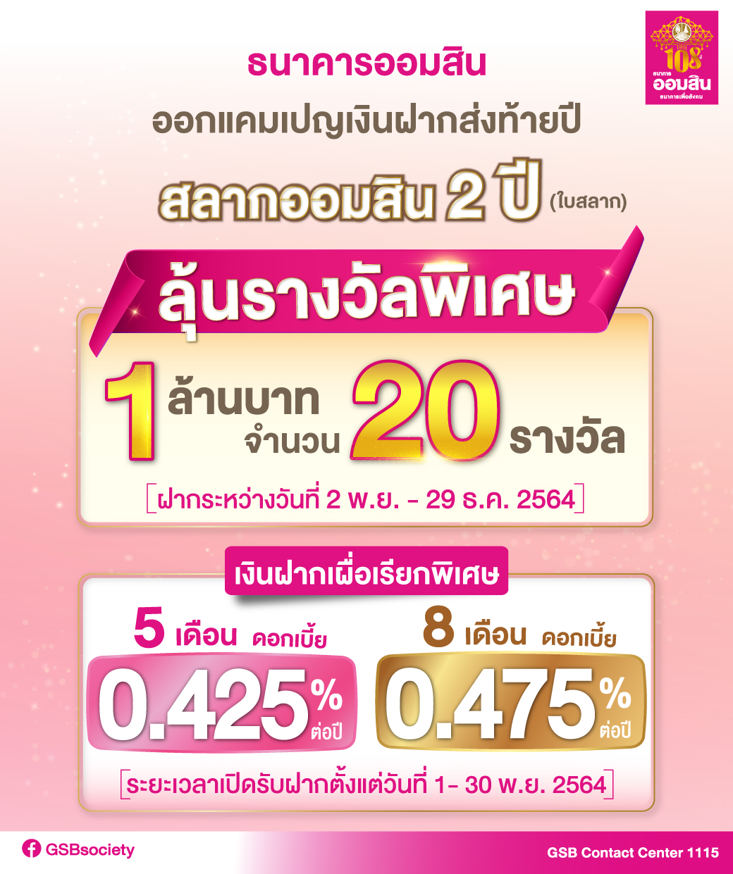 สลากออมสินพิเศษ 2 ปี — ธนาคารอาคารออมสินได้ออก แคมเปญเงินฝากเพื่อส่งเสริมการออมส่งท้ายปี ซึ่งจูงใจด้วยดอกเบี้ยสูงและร่วมลุ้นรางวัลพิเศษ ซึ่งเงินฝากสลากออมสินพิเศษ 2 ปี (ใบสลาก) ราคาหน่วยละ 100 บาท มีสิทธิถูกรางวัลทุกเดือนเป็นเวลานานถึง 24 เดือน รางวัลที่ 1 มูลค่ารางวัล 5 ล้านบาท และรางวัลอื่นๆ อีกมากมาย เงินรางวัลและดอกเบี้ยของบุคคลธรรมดา ไม่เสียภาษี ฝากครบอายุจะโอนเงินต้นและดอกเบี้ยเข้าบัญชีเงินฝากที่เป็นบัญชีคู่โอนโดยอัตโนมัติ