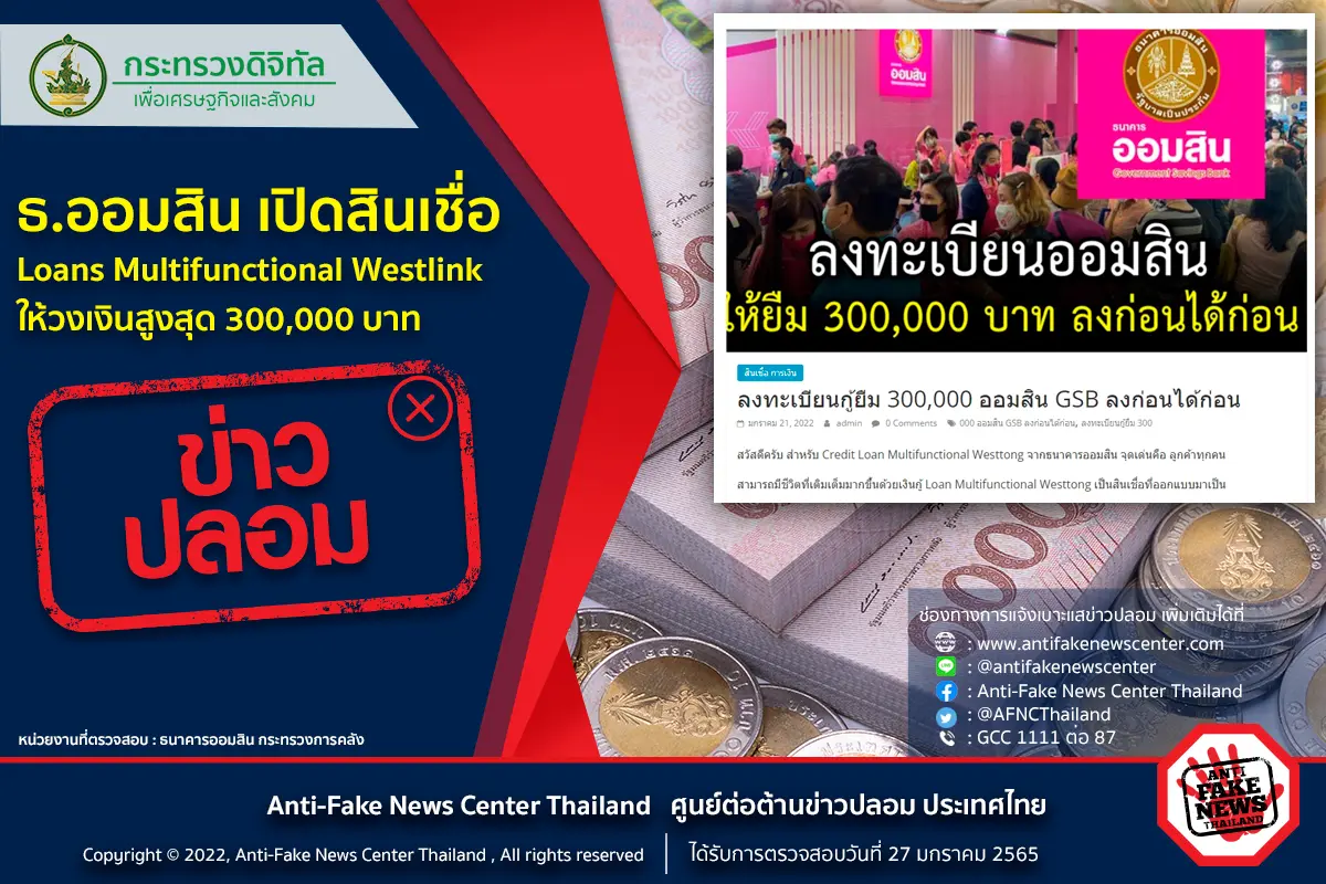 ออมสิน — เมื่อวันที่ 27 ม.ค. 2565 เฟซบุ๊กศูนย์ต่อต้านข่าวปลอม ประเทศได้โพสต์ข้อความระบุว่า ตามที่ได้มีการเผยแพร่ข้อมูลสินเชื่อ Loans Multifunctional Westlink ในช่องทางเฟซบุ๊ก และเว็บไซต์ โดยระบุว่า ออมสิน เปิดสินเชื่อ Loans Multifunctional Westlink วงเงินสูงสุด 300,000 บาท หรือ ลงทะเบียนออมสิน ให้ยืม 300,000 บาท ลงก่อนได้ก่อนนั้น