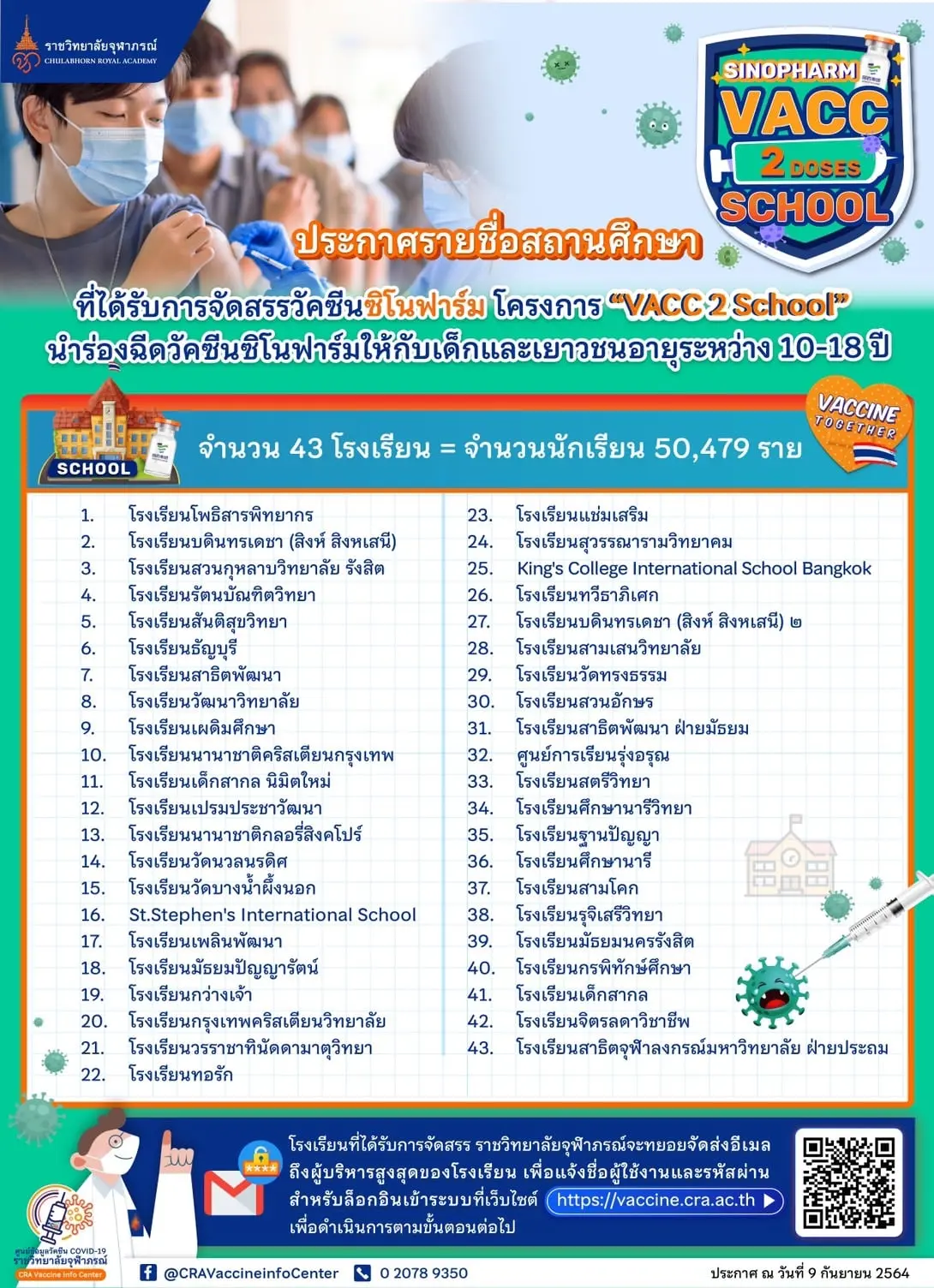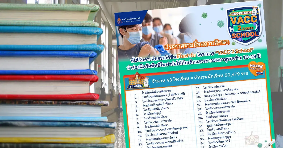เช็กรายชื่อ 43 โรงเรียน ที่ได้รับการจัดสรรวัคซีน “ซิโนฟาร์ม” ฟรี! ในโครงการ “VACC 2 School” รวมจำนวนนร.กว่า 5 หมื่นราย กลุ่มอายุ 10-18 ปี