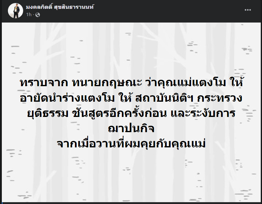 จากกรณีที่ เมื่อวานนี้ (11 มี.ค.2565) นายมงคลกิตติ์ สุขสินธารานนท์ หรือ เต้ มงคลกิตติ์ หัวหน้าพรรคไทยศรีวิไลย์ ได้โพสต์จดหมายถึงพล.อ.ประยุทธ์ จันทร์โอชา นายกรัฐมนตรี ผ่านทางเฟซบุ๊กส่วนตัวเพื่อขออายัดศพนิดา พัชรวีระพงษ์ หรือแตงโม นักแสดงสาวชื่อดัง ที่เสียชีวิตหลังพลัดจากเรือสปีดโบ๊ทในแม่น้ำเจ้าพระยา เนื่องจากคดีนี้ยังมีข้อกังกขาและเงื่อนงำต่างๆที่ยังไม่มีคำอธิบายที่ชัดเจน
