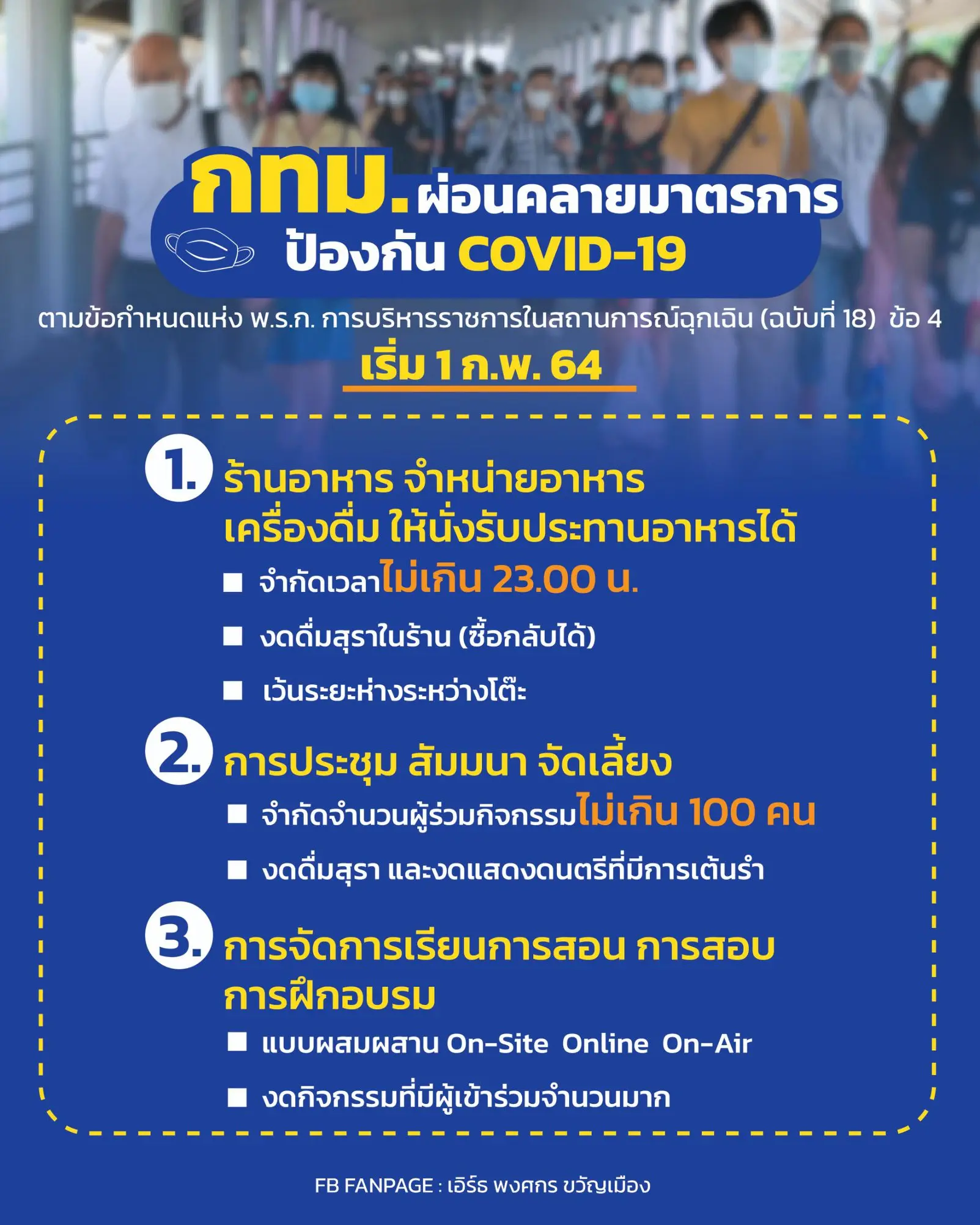 กทม. ผ่อนคลายมาตรการ โควิดกรุงเทพ เริ่มวันที่ 1 กุมภาพันธ์ 2564 โดยกำหนดให้สถานบริการต่างๆมีมาตรการดังนี้