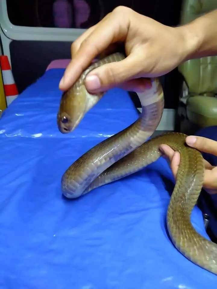 ทางทีมเจ้าหน้าที่จึงได้เดินทางเข้าไปยังที่เกิดเหตุ โดยเจ้าของบ้านก็ได้แจ้งว่างูได้เข้าไปหลบอยู่บริเวณหลังตู้เสื้อผ้า เจ้าหน้าที่จึงใช้ไฟฉายไปส่องดูที่บริเวณหลังตู้เสื้อผ้าก็พบว่าเป็น งูเห่าพ่นพิษสยามสีน้ำตาล ขนาดโตเต็มวัย เจ้าหน้าที่จึงได้แจ้งกับทีมงานให้ทีมงาน แจ้งไปยัง รพ.ว่างูที่กัดเป็นงูเห่าสยามพ่นพิษ ( ยืนยันชนิดของงู ครั้งที่ 1 หลังจากที่เด็กถูกกัดไปประมาณ10นาที)