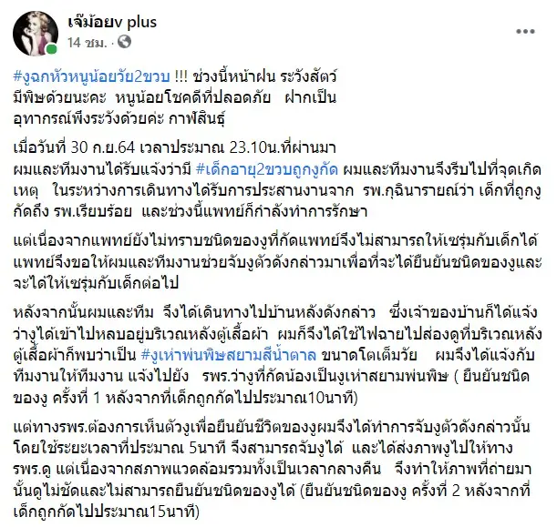 เฟซบุ๊กเพจ เจ๊ม้อยv plus โพสต์เรื่องราวนาทีชีวิตของหนูน้อยวัยสองขวบถูกงูกัดเข้าที่บริเวณศีรษะทราบภายหลังว่างูที่กัดคืองูเห่าพ่นพิษสยามสีน้ำตาล