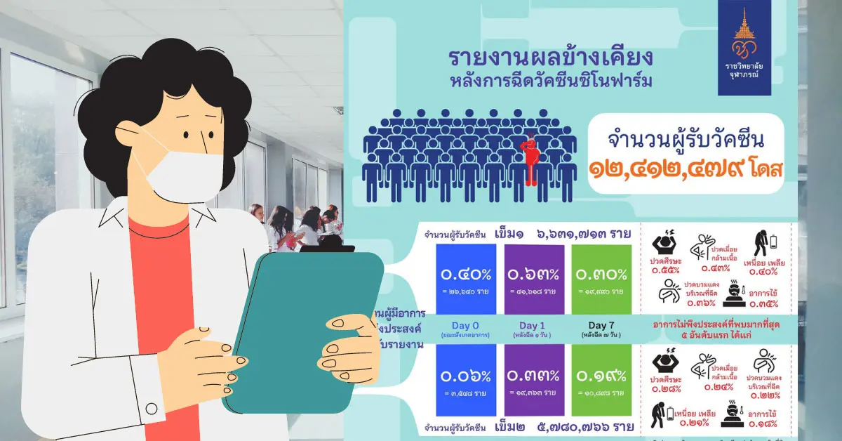 ราชวิทยาลัยจุฬาภรณ์รายงาน ผลข้างเคียงหลังฉีดวัคซีน “ซิโนฟาร์ม” ฉีดแล้วกว่า 12 ล้านโดส ลำดับ1ปวดศีรษะ เผยผู้เสียชีวิตสะสม19ราย