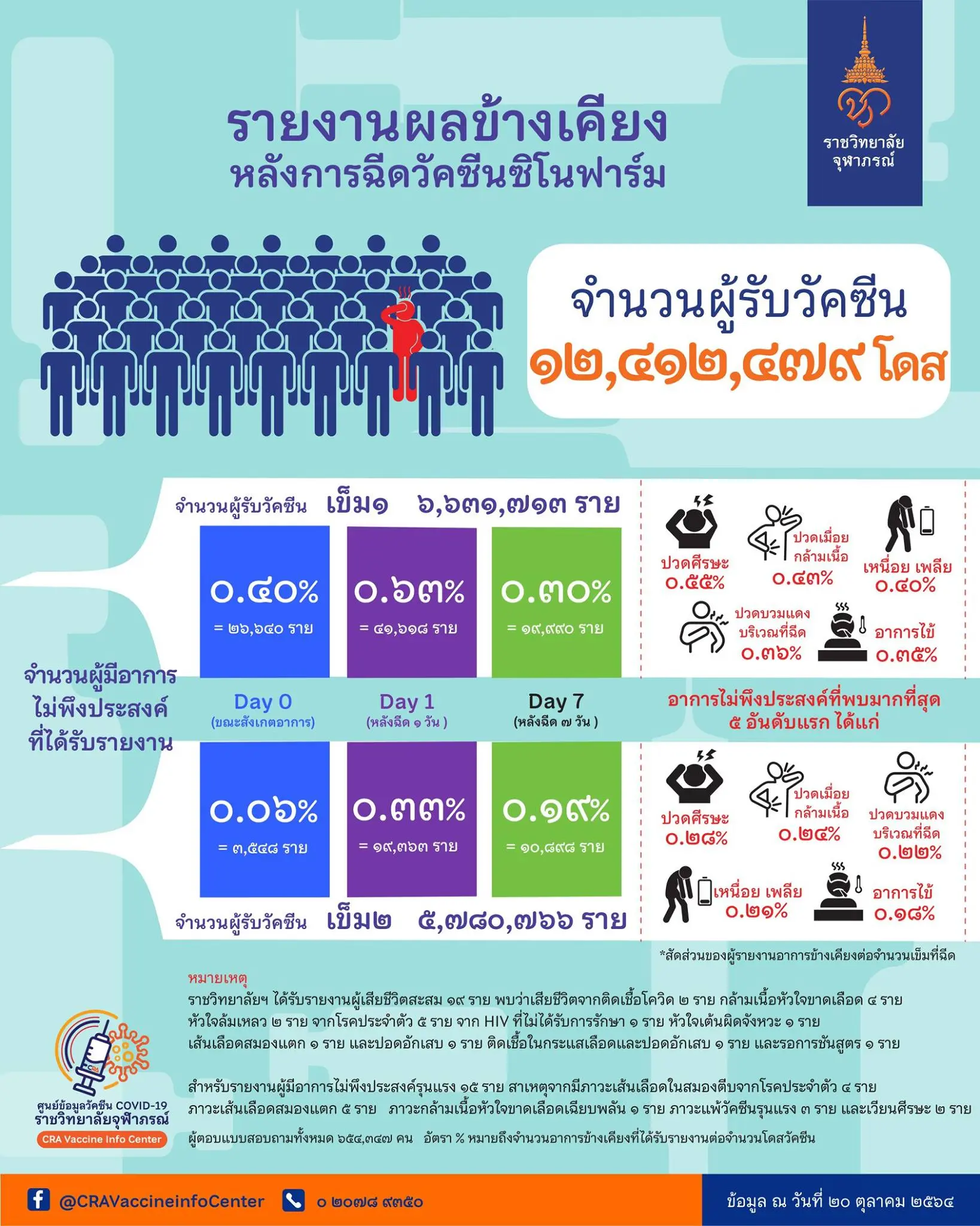 เมื่อวันที่ 22 ตุลาคม 2564 ทางด้านของเพจเฟซบุ๊ก ศูนย์ข้อมูลราชวิทยาลัยจุฬาภรณ์ รายงานผลข้างเคียงจากการฉีดวัคซีนซิโนฟาร์ม หฃังจากที่ดำเนินการฉีดวัคซีนไปแล้ว จำนวน 12,412,479 โดส โดยผลข้างเคียงที่พบมาเป็นอันดับ 1 คือ ปวดศีรษะ ทั้งนี้ยังเผยรายละเอียดผู้เสียชีวิตสะสม จำนวน 19 ราย