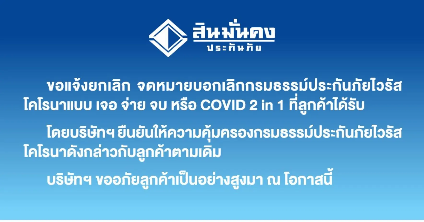 17 ก.ค. 64 มีรายงานข่าวว่า เว็บไซต์ บริษัท สินมั่นคงประกันภัย จำกัด (มหาชน) ขอแจ้งยกเลิก จดหมายบอกเลิกกรมธรรม์ประกันภัยไวรัสโคโรนาแบบ เจอ จ่าย จบ หรือ COVID 2 in 1 ที่ลูกค้าได้รับ โดยระบุว่า