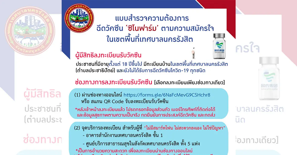 เทศบาลนครรังสิต เปิดเงื่อนไข ลงทะเบียนฉีดวัคซีน “ซิโนฟาร์ม” ฟรี! เริ่มวันนี้ 21 มิ.ย. 64 ถึง 25 มิ.ย. 64 หรือจนกว่าสิทธิการจองจะเต็ม