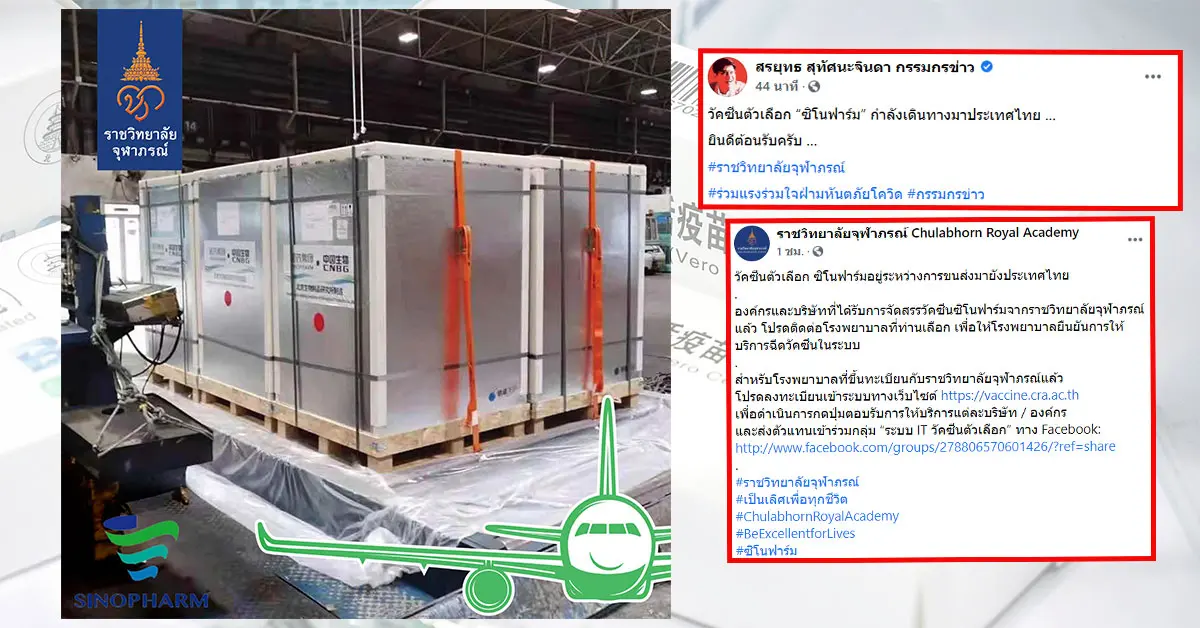 ทางด้านของ คุณสรยุทธ สุทัศนะจินดา ผู้ประกาศข่าวจากรายการเรื่องเล่าเช้านนี้ แลพเรื่องเล่าเสาร์อาทิตย์ทางช่องสาม ได้โพสต์ข้อมูลและรูปผ่านทางเฟซบุ๊กส่วนตัว ” วัคซีนตัวเลือก “ซิโนฟาร์ม” กำลังเดินทางมาประเทศไทย …ยินดีต้อนรับครับ “