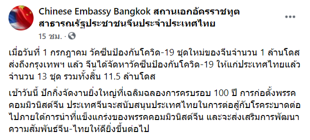 ล่าสุด เมื่อวันที่ 1 กรกฎาคม 2564 ทางเพจเฟซบุ๊ก Chinese Embassy Bangkok สถานเอกอัครราชทูตสาธารณรัฐประชาชนจีนประจำประเทศไทย ได้โพสต์รูแพร้อมข้อมูล ถึงการมาถึงของวัคซีนซิโนแวคล็อตล่าสุดจำนวน 1 ล้านโดสจากประเทศจีน เมื่อวานที่ผ่านมา หากนับรวมจากที่ส่งวัคซีนใหเประเทศไทยแล้วนั้น นี้นับเป็นล็อตที่ 13 ชุด รวมทั้งสิ้น 11.5 ล้านโดส ที่ได้รับจากประเทศจีน