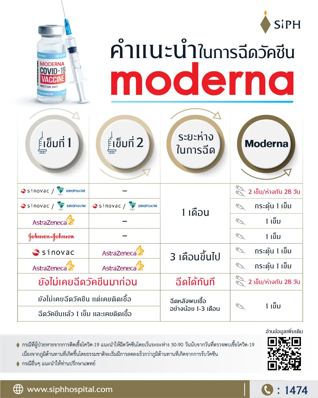- วัคซีนเข็มที่ 1-2 ซิโนแวค/ซิโนฟาร์ม สามารถรับโมเดอร์นา กระตุ้น 1 เข็ม (ห่างจากเข็มที่ 2 เป็นเวลา 1 เดือน)