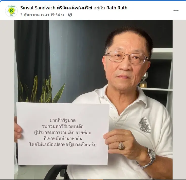 “ฝากถึงรัฐบาล นบกสนหาวิธีช่วยเหลือผู้ประกอบการรายเล็ก รายย่อย ที่เขาขยันทำมาหากิน โดยไม่แบมือขอรัฐบาลด้วยครับ”