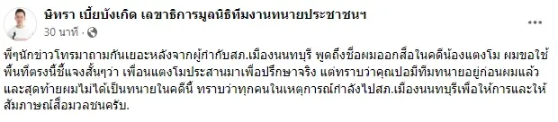 แต่ทราบว่าคุณปอมีทีมทนายอยู่ก่อนผมแล้ว และสุดท้ายผมไม่ได้เป็นทนายในคดีนี้ ทราบว่าทุกคนในเหตุการณ์กำลังไปสภ.เมืองนนทบุรีเพื่อให้การและให้สัมภาษณ์สื่อมวลชนครับ”