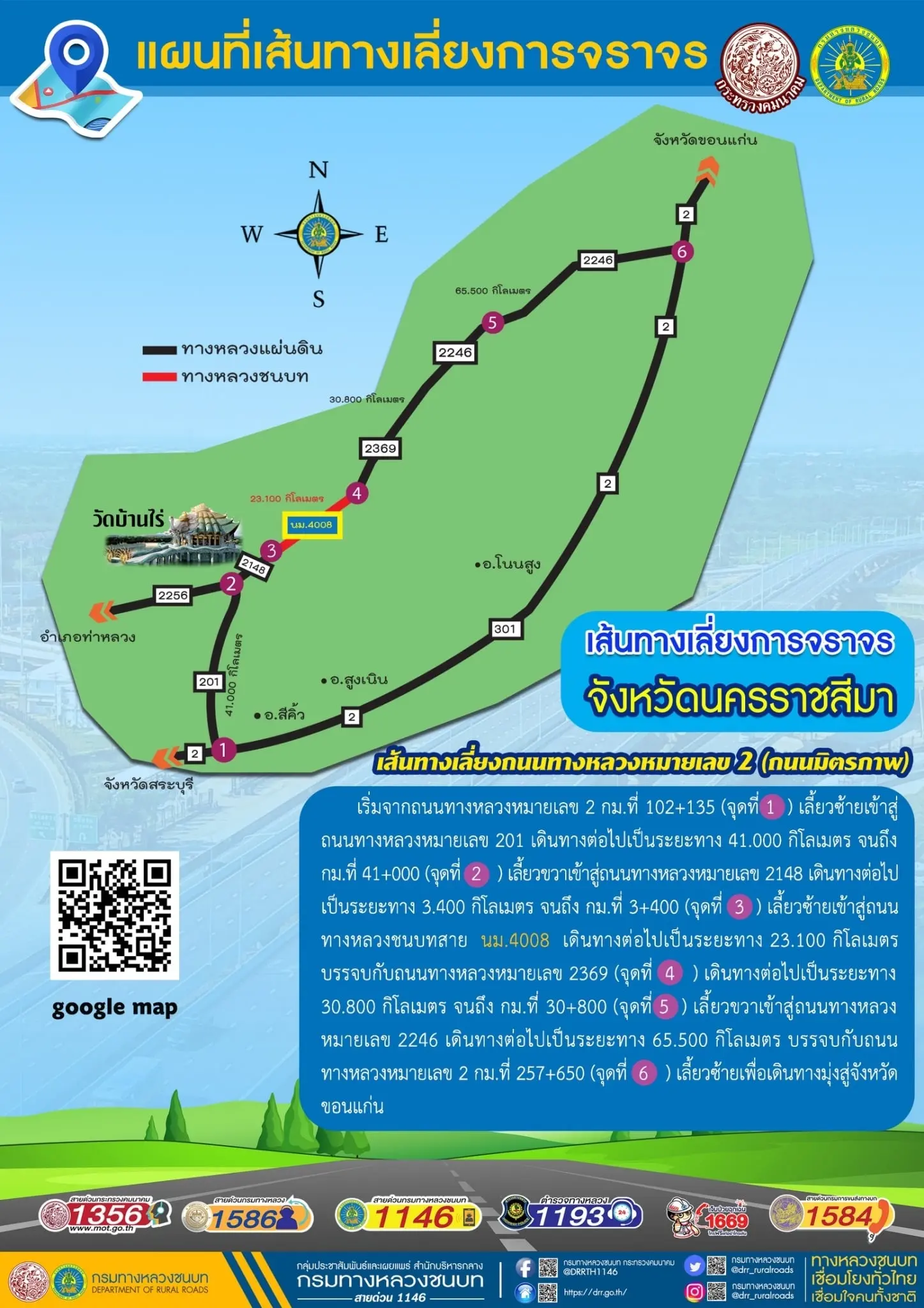 เริ่มจากถนนทางหลวงแผ่นดินหมายเลข 2 กม.ที่ 102+135 (จุดที่ 1) เลี้ยวซ้ายเข้าสู่ถนนทางหลวงแผ่นดินหมายเลข 201 เดินทางต่อไปเป็นระยะทาง 41 กิโลเมตร จนถึง กม.ที่ 41+000 (จุดที่ 2) เลี้ยวขวาเข้าสู่ถนนทางหลวงแผ่นดินหมายเลข 2148 เดินทางต่อไปเป็นระยะทาง 3.4 กิโลเมตร จนถึง กม.ที่ 3+400 (จุดที่ 3) เลี้ยวซ้ายเข้าสู่ถนนทางหลวงชนบทสาย นม.4008 เดินทางต่อไปเป็นระยะทาง 23.1 กิโลเมตร บรรจบกับถนนทางหลวงแผ่นดินหมายเลข 2369 (จุดที่ 4) เดินทางต่อไปเป็นระยะทาง 30.8 กิโลเมตร จนถึง กม.ที่ 30+800 (จุดที่ 5) เลี้ยวขวาเข้าสู่ถนนทางหลวงแผ่นดินหมายเลข 2246 เดินทางต่อไปเป็นระยะทาง 65.5 กิโลเมตร บรรจบกับถนนทางหลวงแผ่นดินหมายเลข 2 กม.ที่ 257+650 (จุดที่ 6) เลี้ยวซ้ายเพื่อเดินทางมุ่งสู่จังหวัดขอนแก่น