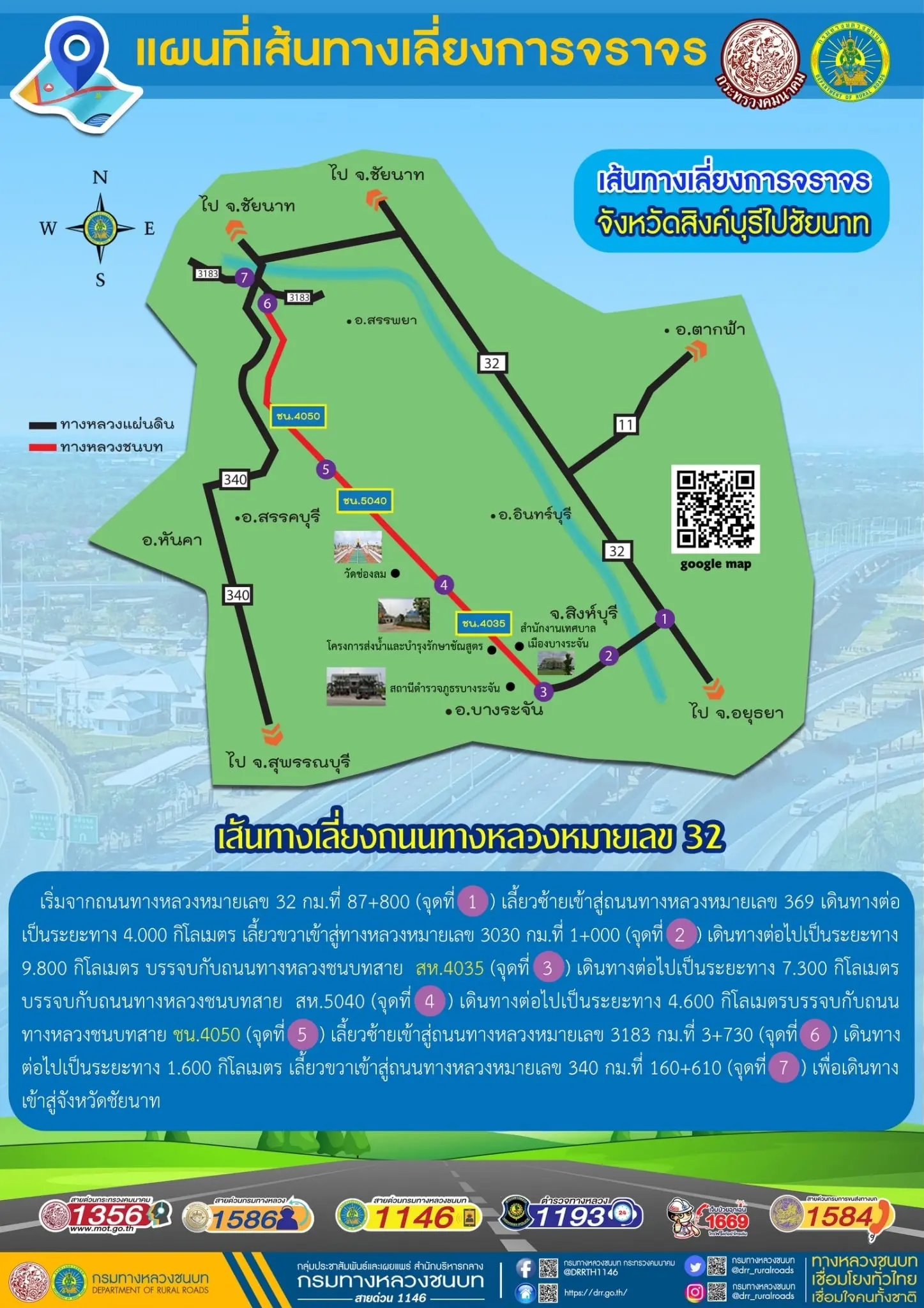 4. จังหวัดสิงห์บุรีไปจังหวัดชัยนาท เส้นทางเลี่ยงถนนทางหลวงแผ่นดินหมายเลข 32