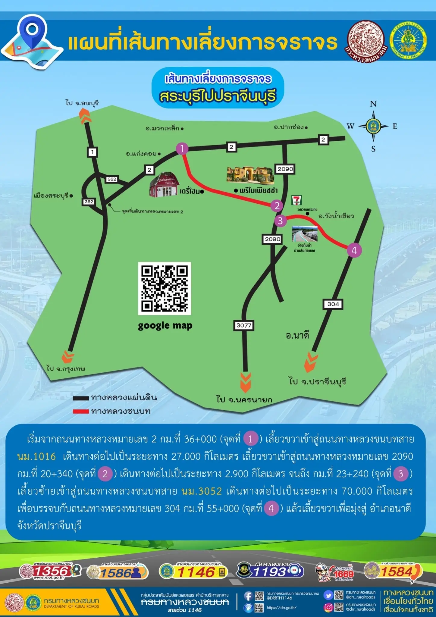 2. จังหวัดสระบุรีไปจังหวัดปราจีนบุรี เส้นทางเลี่ยงถนนทางหลวงแผ่นดินหมายเลข 2 และ 304