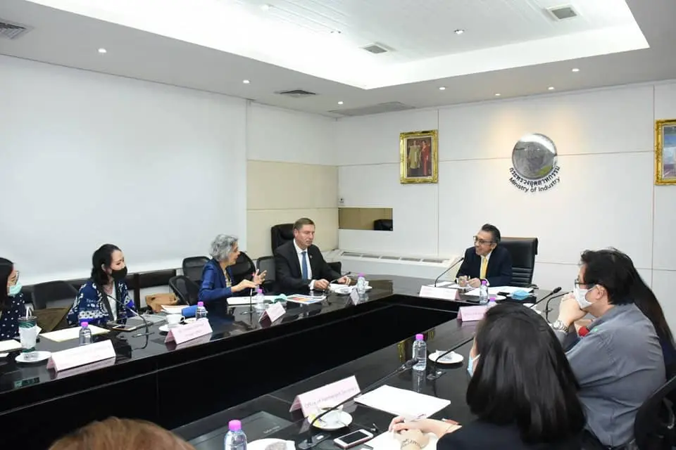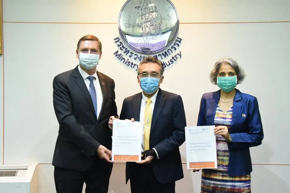 นายภานุวัฒน์ ตริยางกูรศรี รองปลัดกระทรวงอุตสาหกรรม พร้อมคณะผู้บริหาร กระทรวงอุตสาหกรรม และสำนักงานเศรษฐกิจอุตสาหกรรม ให้เกียรติต้อนรับ Mr. Stein Hansen ผู้แทนและผู้อำนวยการสำนักงานภูมิภาคองค์การพัฒนาอุตสาหกรรมแห่งสหประชาชาติ ประจำประเทศไทย (UNIDO) และ Ms. Gita Sabharwal ผู้ประสานงานสหประชาชาติประจำประเทศไทย (UN) ในโอกาสที่ UNIDO ได้จัดทำรายงานผลกระทบจากการแพร่ระบาดของเชื้อไวรัส COVID-19 ในภาคอุตสาหกรรมของประเทศไทย และได้หารือเกี่ยวกับความร่วมมือระหว่างกระทรวงอุตสาหกรรมและองค์การ UNIDO ในการพัฒนาภาคอุตสาหกรรมของประเทศไทยและภูมิภาคอาเซียน ณ ห้องประชุม อก.2 อาคารสำนักงานปลัดกระทรวงอุตสาหกรรม