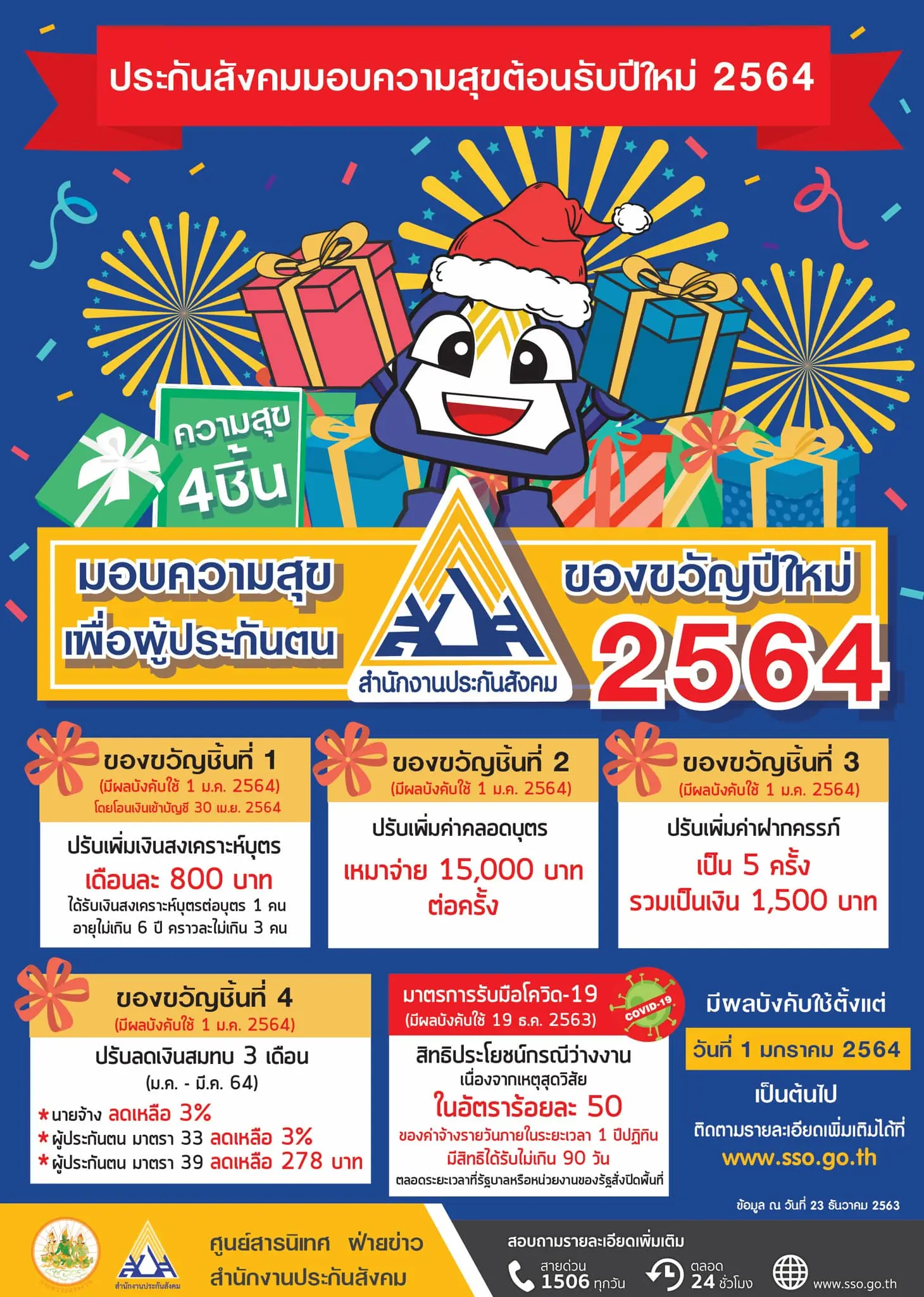 สำนักงาน ประกันสังคม กระทรวงแรงงาน มอบของขวัญปีใหม่ 2564 เพื่อผู้ประกันตน นายสุชาติ ชมกลิ่น รัฐมนตรีว่าการกระทรวงแรงงาน เปิดเผยถึงมติคณะรัฐมนตรี (ครม.) เมื่อวันที่ 22 ธันวาคม 2563 ว่าที่ประชุมฯ ได้เห็นชอบเรื่องการเพิ่มสิทธิประโยชน์เพื่อเป็นของขวัญปีใหม่ 2564 แก่ผู้ประกันตนในระบบกองทุนประกันสังคม มาตรา 33 และมาตรา 39 ตามที่กระทรวงแรงงานเสนอ ดังนี้
