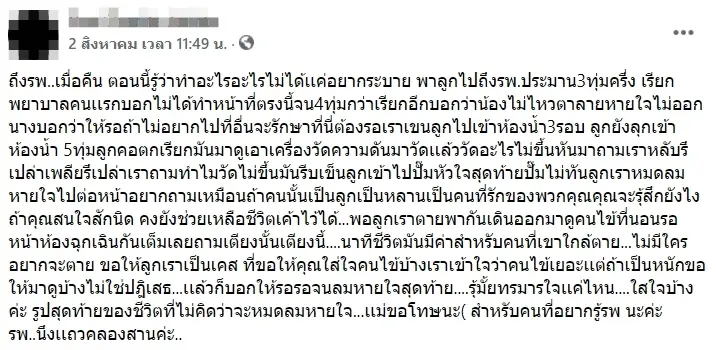 เมื่อวันที่ 2 สิงหาคมที่ผ่านมาผู้ใช้เฟวบุ๊กรายหนึ่งได้โพสต์ข้อความบันทึกเรื่องราวสุดสะเทือนใจใครหลายๆ คน เรื่องราวของแม่คนหนึ่งที่ต้องสุญเสียลูกชายไปต่อหน้า ขณะรอเข้ารับการรักษาจากอาการปวดท้องอยู่ที่โรงพยาบาล โดยเธอได้ระบุข้อความว่า