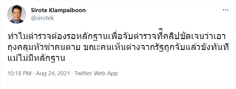 ในขณะเดียวกัน ทางด้านของนาย ศิโรตม์ คล้ามไพบูลย์ ได้โพสต์ผ่านทางทวิตเตอร์ส่วนตัว Sirote Klampaiboon ระบุว่า ” ทำไมตำรวจต้องรอหลักฐานเพื่อจับตำรวจที่ีคลิปชัดเจนว่าเอาถุงคลุมหัวฆ่าคนตาย ขณะคนเห็นต่างจากรัฐถูกจับแล้วขังทันทีแม้ไม่มีหลักฐาน “