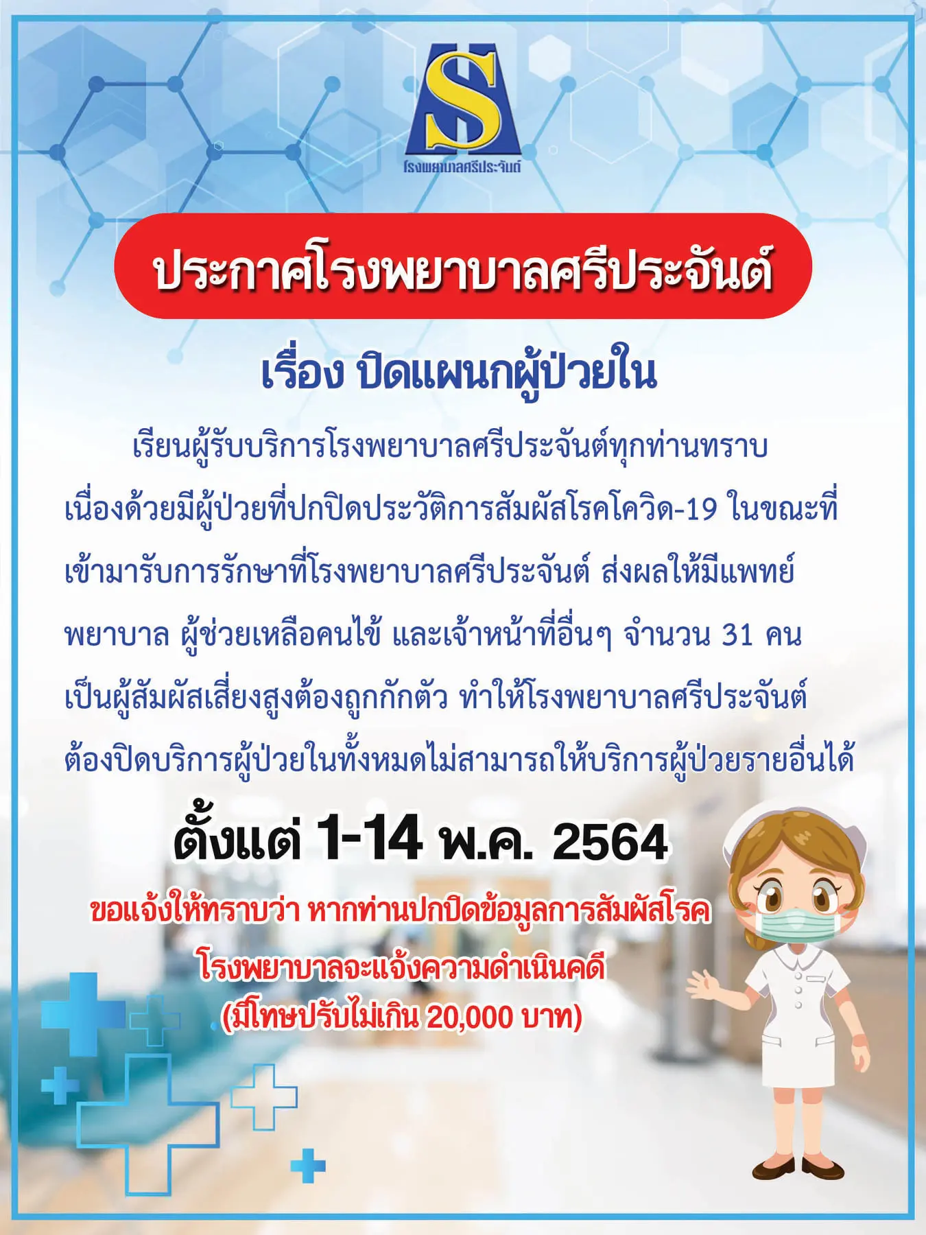 เมื่อวันที่ 1 พฤษภาคม ที่ผ่ามา เฟซบุ๊กเพจ โรงพยาบาลศรีประจันต์ สุพรรณบุรี ได้ประกาศปิดแผนกผู้ป่วยใน หลังจากพบว่ามีผู้ป่วยติดเชื้อโควิด-19 ปกปิดไทม์ไลน์จึงจำเป็นต้องกักตัวเจ้าหน้าที่จำนวน 31 ราย โรงพยาบาลศรีประจันต์จึงต้องปิดให้บริการผู้ป่วยในทั้งหมด ไม่สามารถให้บริการผู้ป่วยรายอื่นได้ ตั้งแต่วันที่ 1 พ.ค. จนถึงวันที่ 14 พ.ค. 64 แต่ยังคงเปิดให้บริการสำหรับผู้ป่วยนอก ผู้ป่วยฉุกเฉิน และผู้ป่วยคลอด