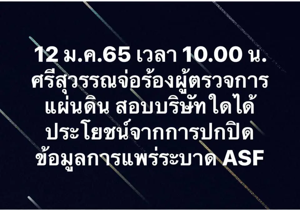 นายศรีสุวรรณ จรรยา เลขาธิการสมาคมองค์การพิทักษ์รัฐธรรมนูญไทย เตรียมร้องผู้ตรวจการแผ่นดิน สอบบริษัทใดได้ประโยชน์จากการปกปิด ข้อมูลการแพร่ระบาด ASF