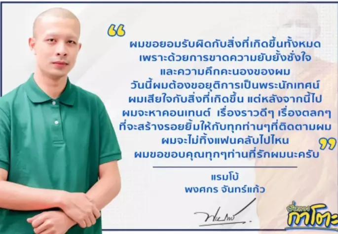 ผมขอยอมรับผิดกับสิ่งที่เกิดขึ้นทั้งหมดเพราะด้วยการขาดความยับยั้งชั่งใจและความคึกคะนองของผมวันนี้ผมต้องขอยุติการเป็นพระนักเทศน์ผมเสียใจกับสิ่งที่เกิดขึ้น แต่หลังจากนี้ไป ผมจะหาคอนเทนต์ เรื่องราวดีๆ เรื่องตลกๆที่จะสร้างรอยยิ้มให้กับทุกท่านๆที่ติดตามผมผมจะไม่ทิ้งแฟนคลับไปไหนผมขอขอบคุณทุกๆท่านที่รักผมนะครับ