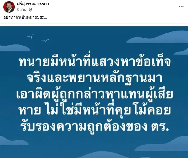 ศรีสุวรรณ โพสต์เดือดต่อเนื่อง โพสต์ข้อความผ่านโลกออนไลน์ ซัดอย่าทำตัวเป็นทนายขยะ แนะทนายควรมีหน้าที่หาความจริง