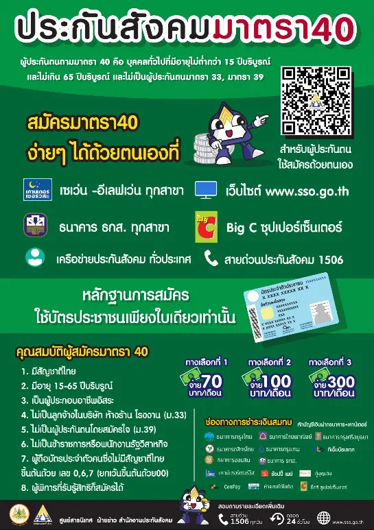 ทั้งนี้ เมื่อสมัครแล้วสามารถจ่ายเงินสมทบได้ทันที สอบถามรายละเอียดเพิ่มเติมได้ที่ สำนักงานประกันสังคมกรุงเทพมหานครพื้นที่/ จังหวัด/ สาขา ทั่วประเทศ หรือที่สายด่วน 1506 ให้บริการไม่เว้นวันหยุดราชการตลอด 24 ชั่วโมง