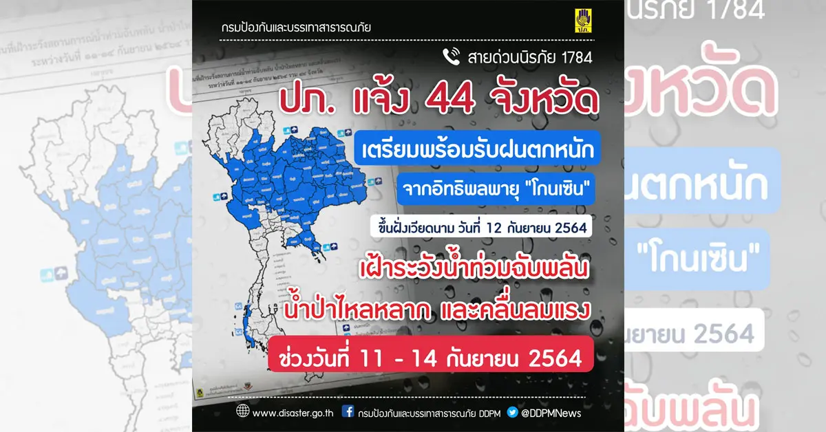 เมื่อวันที่ 11 กันยายน 2564 ทางเพจเฟซบุ๊ก กรมป้องกันและบรรเทาสาธารณภัย DDPM โพสต์ประกาศว่า กระทรวงมหาดไทย โดยกรมป้องกันและบรรเทาสาธารณภัย (ปภ.) ประสาน 44 จังหวัด ภาคเหนือ ภาคตะวันออกเฉียงเหนือ ภาคกลาง ภาคตะวันออก และภาคใต้ เตรียมพร้อมรับมือฝนตกหนัก เฝ้าระวังน้ำท่วมฉับพลัน น้ำป่าไหลหลาก และคลื่นลมแรง ในช่วงวันที่ 11-14 ก.ย. 2564 โดยจัดเจ้าหน้าที่ติดตามสภาพอากาศปริมาณฝน ระดับน้ำ และแนวโน้มสถานการณ์ภัยอย่างใกล้ชิด พร้อมจัดชุดเคลื่อนที่เร็ว เครื่องมืออุปกรณ์ประจำพื้นที่เสี่ยงให้พร้อมปฏิบัติการเผชิญเหตุและช่วยเหลือผู้ประสบภัย สำหรับประชาชนขอให้ติดตามพยากรณ์อากาศและปฏิบัติตามประกาศเตือนภัยอย่างเคร่งครัด