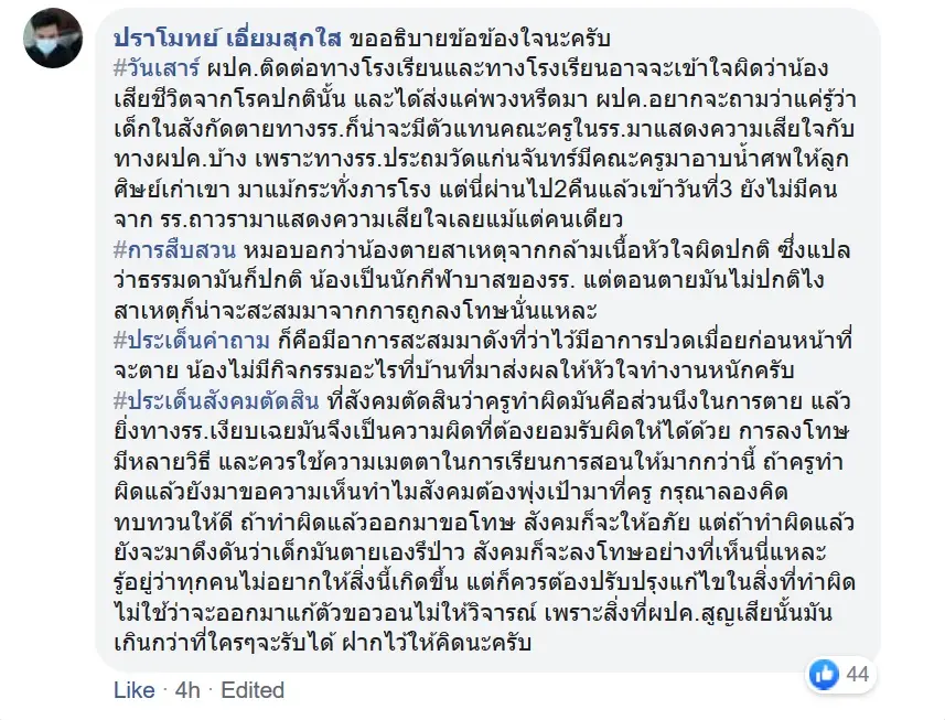 นักเรียนเสียชีวิต – เกิดกระแสวิพากษ์วิจารณ์ในโลกโซเชียล เกี่ยวกับกรณีการเสียชีวิตของนักเรียนที่ถูกครูทำโทษด้วยการให้ลุกนั่ง 100 ครั้ง เนื่องจากไม่ได้ทำการบ้านมา ต่อมาทราบว่านักเรียนคนดังกล่าวมีอาการป่วย จนต้องเข้าโรงพยาบาล ก่อนที่จะถูกลงโทษ และมีอาการกล้ามเนื้อหัวใจผิดปกติ
